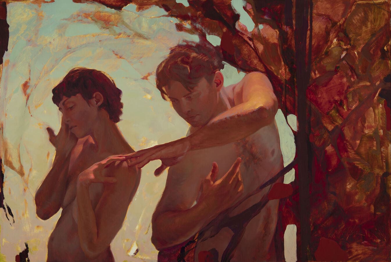 Time and place are irrelevant to her pieces. The idea that it could be any time combined with the abstract nature of the environment means it could also be any place which makes the artwork more relatable. This also allows the Expressionist nature of the intense colors and loose strokes to take importance over the exact narrative. Halee also uses nudes because they are no longer confined by period wardrobe. She uses drapery for compositional means. It can add just the color pop she needed without compromising the timeless beauty of the figure. “The use of draped figures can feel classical, which is just fine given that my process of layering transparent colors is very traditional”.