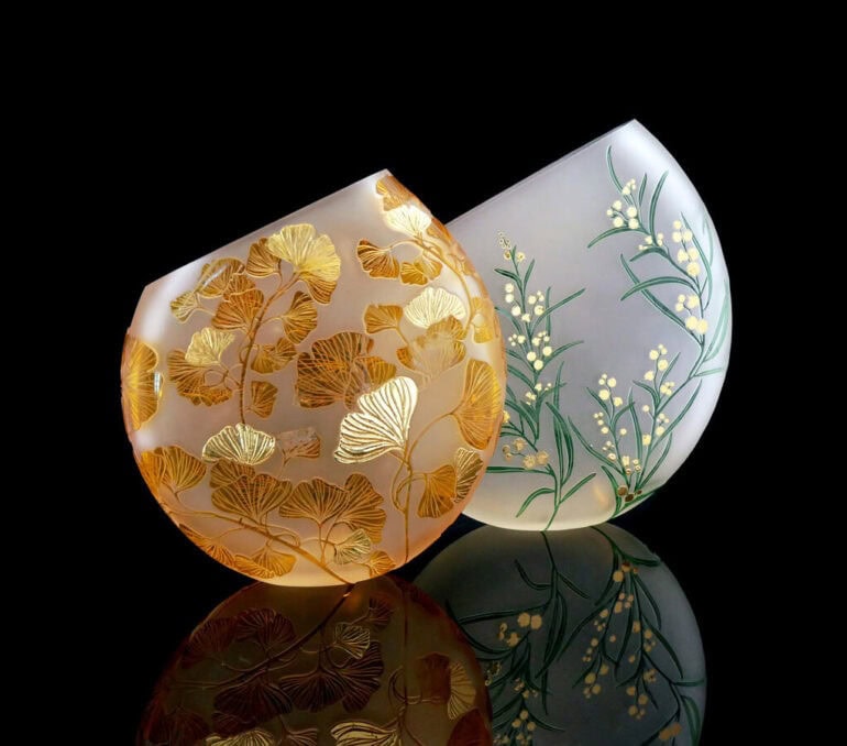 Jessica Murtagh is a South Australian glass artist whose practice combines traditional glassblowing with illustration. She uses a modern take on the ancient style of glass carving called cameo glass, employing illustration software and industrial sandcarving processes to engrave glass. She holds a Master of Design (Contemporary Art) from the University of South Australia. Working primarily with blown glass, Jessica uses sandcarving and engraving to create intricate imagery and layered narratives on vessel forms that range from sculptural to functional.
