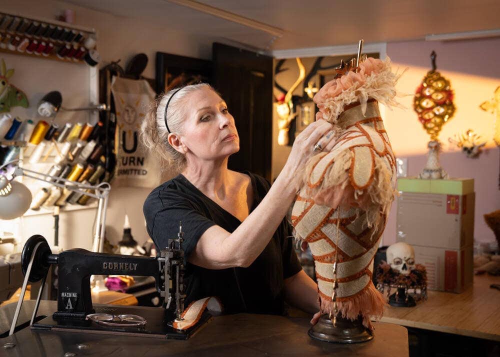 Often dark and thought-provoking, Selene Mauri Cochrane’s work invites viewers to look inward and confront their own internal landscapes. Through recurring esoteric and existential themes—myth, fantasy, and a symbolic visual language—she brings forward truths that can be beautiful, uncomfortable, and often unspoken. Each piece is highly detailed and ornate, with every element meticulously crafted by hand, from ceramic pins and jewels to delicate hand-stitched lace and trims made on her antique Cornely machine. This commitment to fine craftsmanship echoes the layered, tangled nature of human experience.