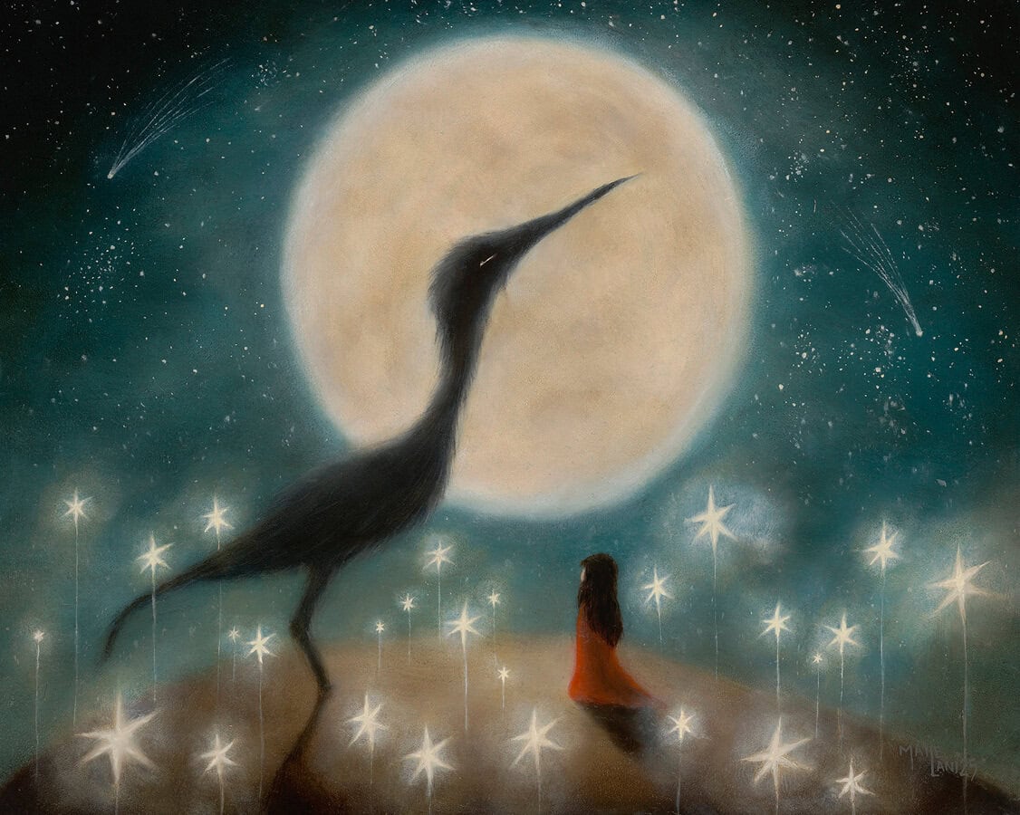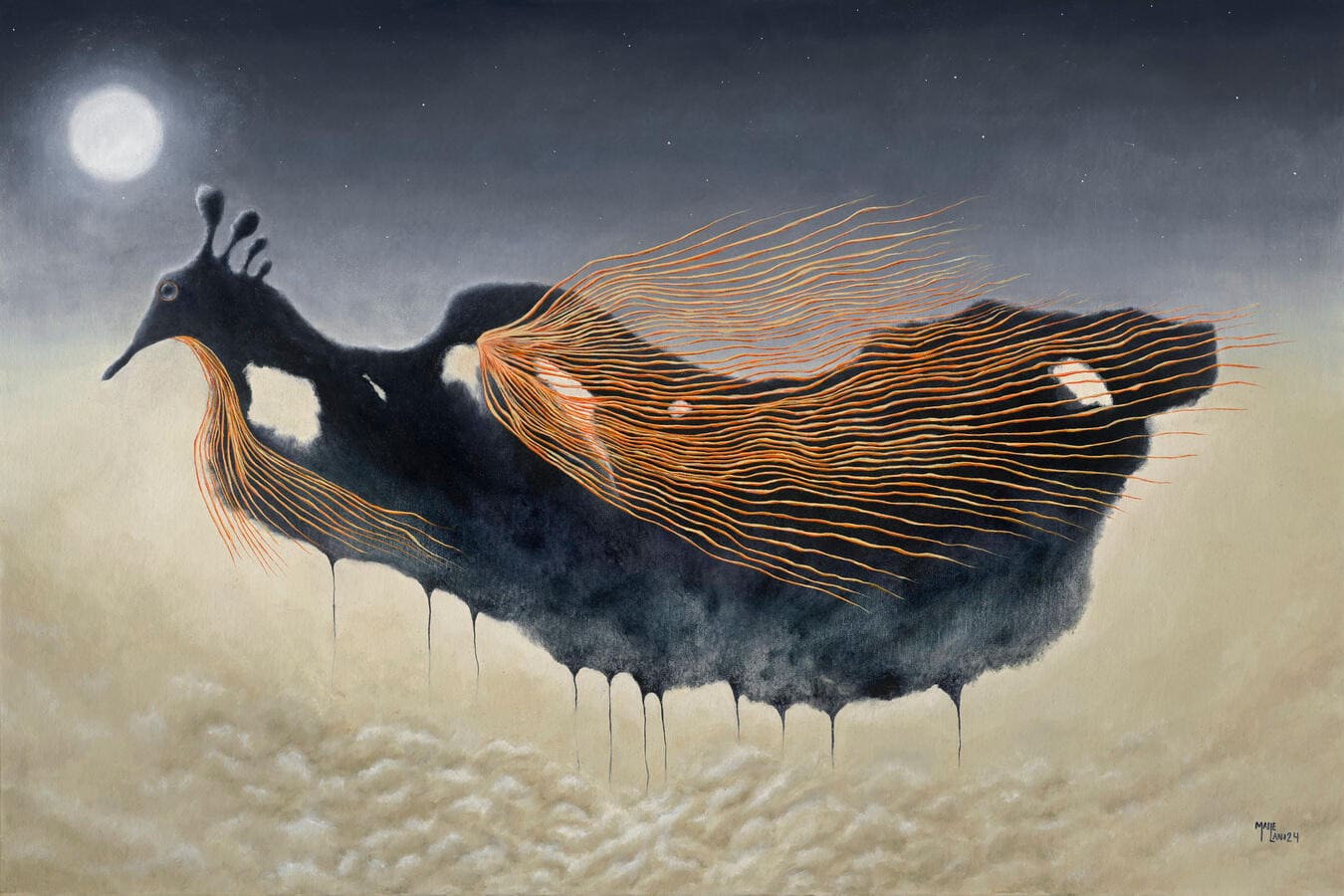 Maile Lani’s work explores imagined worlds that blend myth, nature, and subtle surrealism into rich, symbolic paintings inspired by dreams and childhood memories. Her work leans on the more emotional and symbolic side, creating scenes that feel like little visual maps of places one may have forgotten to remember.