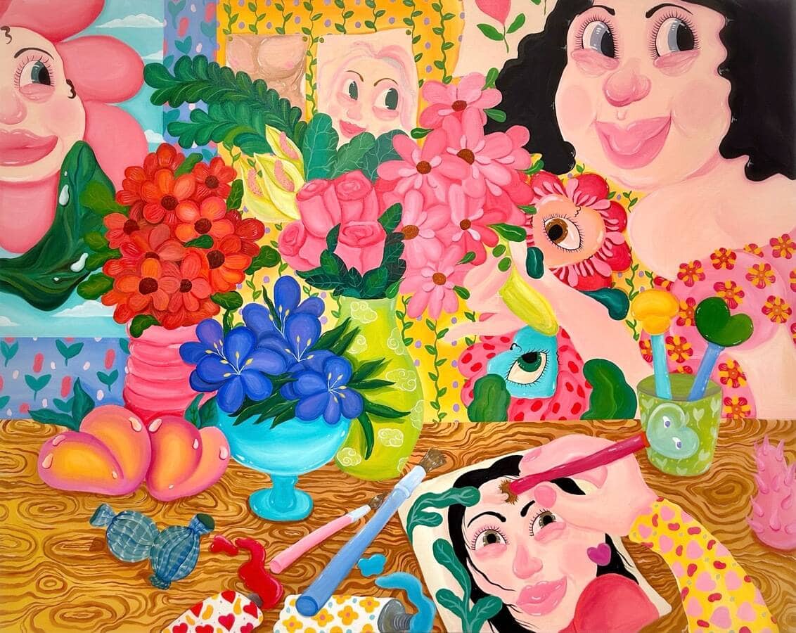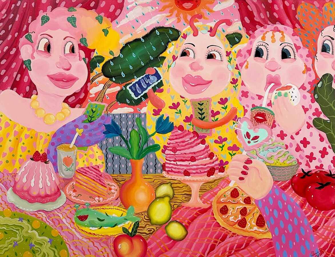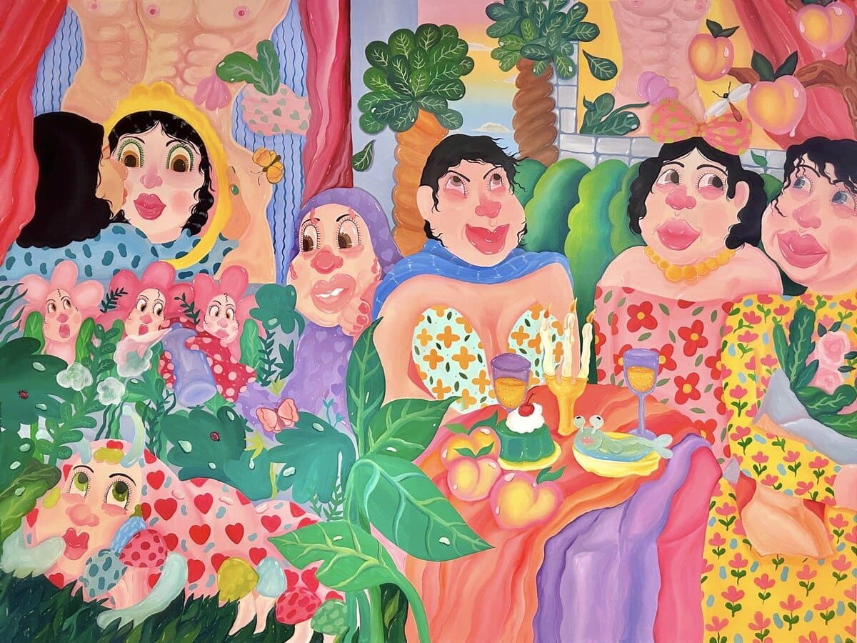 His paintings feature exaggerated theatrical scenarios depicting temple fairs, shopping malls, karaoke bars, beauty salons, and domestic spaces where characters navigate social hierarchies and perform cultural rituals. The work critically examines women’s roles in contemporary China, particularly middle-aged women (dama) who embody conflicting values, conservative yet westernized, frugal yet status-conscious.